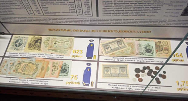 Рассказывается также о других вознаграждениях чинов Российского Императорского флота. В экспозиции приводятся сведения о среднемесячной зарплате в Российской империи в 1913 году. Посетители смогут также узнать о возможностях дореволюционного рубля и рубля сегодняшнего, приводятся цены на вещи, услуги и продовольствие в 1913 году. Выставка «Денежное довольствие чинов Российского Императорского флота в начале ХХ века» будет открыта для посещения до 31 декабря 2021 года.