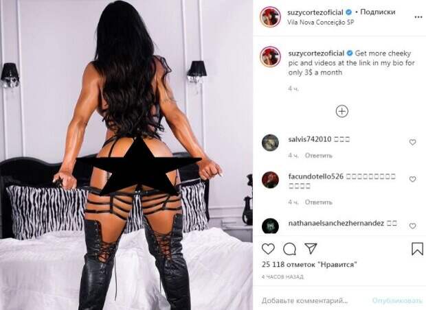 Соблазнительная красотка выпятила свою пятую точку, чтобы дать возможность своим поклонникам ее рассмотреть. Трусиков практически не было видно, они запрятались между ягодицами. От талии тянулись черные линии ткани, в итоге обвившие ножки. Также Сьюзи надела черные ботфорты, натянувшиеся выше колен, кокетливые завязочки придавали образу пикантности. Модель распустила длинные волнистые волосы, которые струились по спине. Звезда взяла в руки плеть и натянула ее концы чуть ниже своих ягодиц. За четыре часа пост собрал более 25 тысяч лайков и много комментариев. Пользователи сети написали Кортес массу комплиментов, отметив, что ее снимки один идеальнее другого. Напомним, Сьюзи Кортес предстала в соблазнительном нижнем белье, которое казалось невидимым. Модель присела на стул, повернувшись к фотографу полубоком. Звезда была в черном бикини и лифчике. Маленький бюстгальтер с кружевом хорошо смотрелся на груди красотки, а тонкие лямки оплели спинку модели. Ранее сообщалось, что Сьюзи Кортес была в трусиках-бикини, которые натянула выше бедер. Она немного выгнулась для более эффектного кадра. Видно, что красотка была в маленьком купальнике. Лифчик обтянул идеальную грудь модели. Напомним, хозяйка самых красивых ягодиц раздвинула ноги и поразила формами А еще Politeka писала, что хозяйка самых красивых ягодиц засветила горячие "персики" перед зеркалом Также Politeka сообщала, что горячая хозяйка самых красивых ягодиц выставила свою гордость посреди улицы