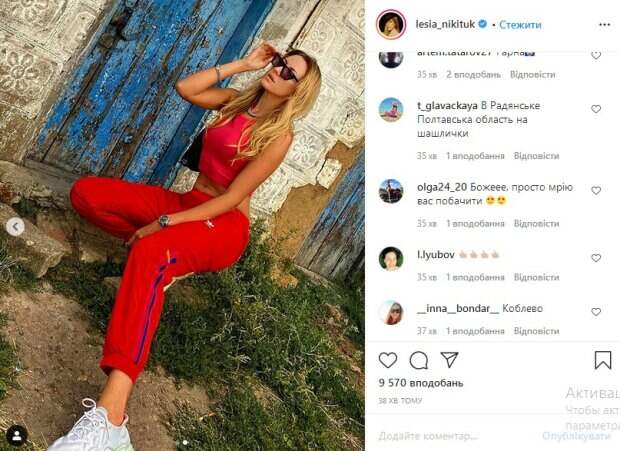 На другом снимке знаменитость позирует все в той же одежде, но уже сидя. «Принцесса Троещины», «Леська, ты лучшая», «штанишки красивые, но немого великоваты», «суперский», «боже, просто мечтаю вас увидеть», - пишут ее поклонники. Напомним, шаловливая Никитюк покрутила упругим богатством в одном бикини А еще Politeka писала, что горячая Никитюк сверкнула дарами природы посреди ванной Также Politeka сообщала, что шаловливая Никитюк на фоне раздетого мужчины пустилась «во все тяжкие»