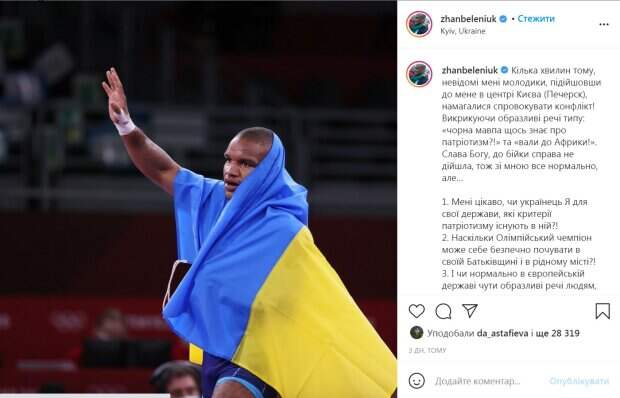 А 13 августа он сообщил, как в Киеве его атаковали неизвестные парни с расистскими взглядами. Ему выкрикивали фразы: «черная обезьяна что-то знает о патриотизме?!» и «вали в Африку!». Это происшествие заставило Беленюка, рожденного в Киеве, задаться вопросом о том, считается ли он украинцем для своего государства, и какие в нем существуют «критерии патриотизма». Наталья Могилевская отреагировала на происшествие довольно резко. «Ваше счастье, что он не убил вас, а мог», - написала она. Также она решила продублировать вопросы, котрые возникли у Беленюка после происшествия: 1. Мені цікаво, чи українець Я для свої держави, які критерії патріотизму існують в ній?! 2. Наскільки Олімпійський чемпіон може себе безпечно почувати в своїй Батьківщині і в рідному місті?! 3. І чи нормально в європейській державі чути образливі речі людям, які кладуть життя на її прославляння?! «Жан, ты самый украинский украинец, которого я встречала», - подытожила Могилевская. Напомним, Беленюк завоевал для Украины золотую медаль на Олимпиаде, подробности. Как сообщала Politeka, Беленюк отчитал чиновников за результаты Олимпиады для Украины. Также Politeka писала, что олимпийский чемпион Беленюк рассказал о зазывании на "Танці з зірками" и своем решении.