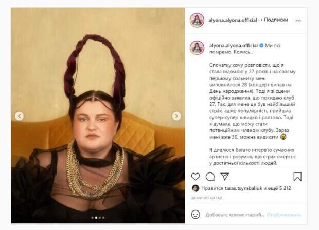 Из-за этого было открыто дело, которое, как отметила девушка, идет в суд. И вот, после этого, девушка заговорила о неизбежном, опубликовав новый пост в Инстаграм. "Мы все умрем. Когда-то ... Сначала хочу рассказать, что я стала известной в 27 лет и на своем первом сольнике мне исполнилось 28 (концерт выпал на День рождения). Тогда я со сцены официально заявила, что покидаю клуб 27. Да, для меня это был самый большой страх, ведь популярность пришла супер-супер быстро и внезапно. Тогда я думала, что могу стать потенциальным членом клуба. Сейчас мне уже 30, можно выдыхать. Я смотрю много интервью современных артистов и понимаю, что страх смерти у достаточного количества людей. Например, об этом недавно говорила @ kazka.band на интервью в @mashaefrosinina. Как-то слушая окружение и сочетая со своим жизненным опытом, я приняла, что смерть - неизбежна штука. Рано или поздно мы все равно умрем и здесь уже никак; соломы не подстелите", - написала девушка. На кадрах рэперша была в прозрачном наряде. Образ дополнила Алена дьявольскими рожками. Фанаты поставили более 5 тысяч лайков и написали комментарии: "Воу-воу", "Прочитала "я стала ведьмой в 27 лет", "Глупо думать о сметри при жизни". Напомним, у Alyona Alyona возникли проблемы с законом Также Politeka сообщала, что Софиевскую площадь начали отмывать после дрифта А еще Politeka писала, что Alyona Alyona открестилась от выходки в центре Киева, за дело взялась полиция