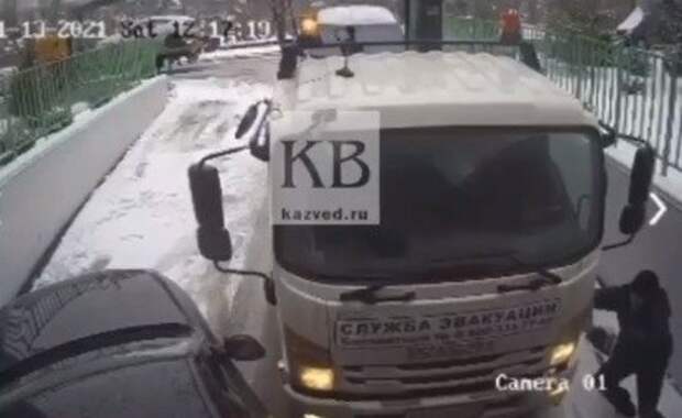 В казанском ЖК «Весна» на улице Аббасова эвакуатор въехал в легковой автомобиль, сообщают «Казанские ведомости». Камеры наблюдения зафиксировали, как эвакуатор, приехавший забрать автомобили, занесло из-за гололеда. Сотрудник службы попытался остановить машину собственным весом, но это ни к чему не привело.