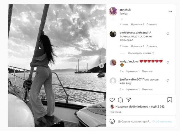 Красотка решила показать в Инстаграм, как проводит время на курорте. На новых кадрах Анна стояла в штанах, повернувшись спиной к камере. Также красотка показала несколько видео, на которых прогулялась по яхте, демонстрируя роскошные виды. "Сейчас вся ее жизнь казалась такой маленькой и далекой, что Аделин забыла о ней — просто стояла и смотрела на бескрайнюю громаду воды всех оттенков синего, и взгляд летел далеко-далеко, и она летела с ним туда, к горизонту, где морская синь сливалась с небесной. Цитата из книги "Ведьма западных пустошей", - написала Анна. Фанаты поставили более 2 тысяч лайков, включая Дантеса, и написали комментарии: "А почему,лицо постоянно прячешь?", "Ммм", "Попа лучше, чем вид". Напомним, экс-жена Позитива устроила дорогой отдых вместе с Каменских на курорте А еще Politeka сообщала, что загорелый Потап в отпуске с тещей и экс-женой Позитива похвастался обновками Также Politeka писала, что экс-жена Позитива сверкнула ножками на лестнице в игривом мини, подобрав идеальный ракурс