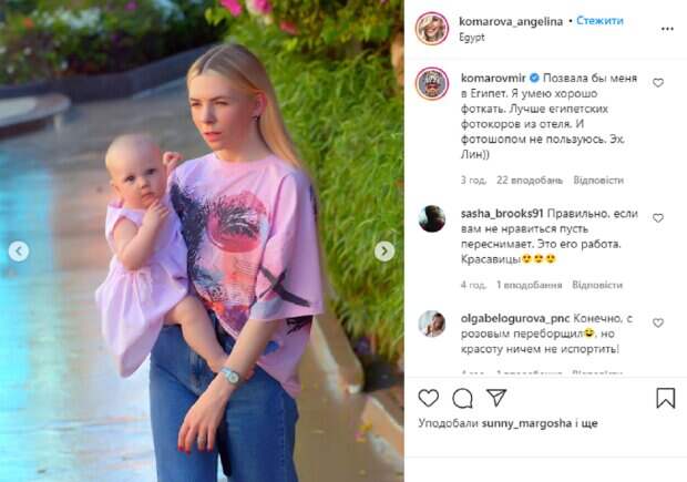 А еще она молодая мама и блогер в Instagram, где часто радует своих подписчиков яркими фото и видео из жизни. Недавно Ангелина с мужем и маленькой дочкой отправилась на отдых в Египет, откуда показала яркие снимки. А в подписи к публикации рассказала, как намучила отельного фотографа во время съемки. На снимках девушка запечатлена на фоне красивых пляжных локаций среди цветов, а на руках она держит свою малышку-дочь. Перед камерой Комарова появилась в стильном образе – на ней широкие джинсы и яркая розовая футболка оверсайз с принтом. Волосы девушки аккуратно уложены, а на лице легкий макияж. В подписи к публикации Ангелина рассказала о приключениях с фотографом. "Мой бедный фотограф 2 часа таскался за мной с ананасом в руках для красивого кадра по всей территории отеля. Он пытался ставить меня в "стандартные" позы, а я ругалась и заставляла все переснимать. Он ругался, говорил, что устал, что ему уже пора идти, но я стояла на своем! А потом фотограф не решался показывать фотки, говорил, что я буду все критиковать!", - поделилась девушка. Надо сказать, что в комментариях к фотографиям объявился брат девушки Дмитрий Комаров. "Позвала бы меня в Египет. Я умею хорошо фоткать. Лучше египетских фотокоров из отеля. И фотошопом не пользуюсь. Эх, Лин", - написал телеведущий. Напомним, Комаров из "Мир наизнанку" попал в неприятную ситуацию на борту самолета: кадры конфуза. Как сообщала Politeka, Комаров из "Мир наизнанку" откровенно рассказал о трудностях в экспедиции: "Живу в шкафу под одеялом...". Также Politeka писала, Красавица-жена Комарова из "Мир наизнанку" закуталась в шубку и заскучала по весне: "Совершенство!".
