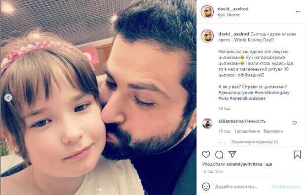 На новом снимках сначала Соля целует заботливого папочку, а потом он ее чмокает в щеку. Выглядят они по-настоящему мило и очаровательно. В подписи к публикации Дэвид рассказал о традиции целоваться у них дома. "Сегодня очень клевое праздник – World Kissing Day. Например, мы дома все лечим цемками, ну и награждаем цемками, и когда кто-то куда-то идет, то у нас есть маленький ритуал 10 цемок и обнимашки. А как у вас? Дела с цемками?", - написал артист. Напомним, Звезду "Голоса країни" и мужа Мозговой, поборовшего ковид, готовят к операции: "Держу кулаки". Как сообщала Politeka, Беда у звезды "Голосу країни" Аксельрода, артисту требуется операция: «Я доигрался…». Также Politeka писала, Беда с экс-супругой Пономарева Мозговой, срочно понадобилась помощь медиков: "Накололи...".