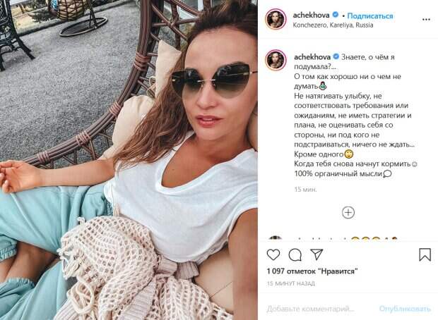 Ведущая смотрит в камеру сквозь свои стильные очки. «Знаете, о чём я подумала?...О том как хорошо ни о чем не думать. Не натягивать улыбку, не соответствовать требования или ожиданиям, не иметь стратегии и плана, не оценивать себя со стороны, ни под кого не подстраиваться, ничего не ждать...Кроме одного. Когда тебя снова начнут кормить», - написала она в подписи к фото. Подписчики тут же принялись комментировать пост. «Как хорошо ничего не делать! Да ещё и кормят по расписанию! Красота!», «Идеально», «Эх, Анфисушка, замуж вам опять пора», - пишут люди. До этого мы писали, что Чехова решила похвастаться новым украшением, которое она приобрела на днях. Она выложила фотографию, где позирует в темно-синем платье с глубоким вырезом на груди, а ее шею украшает жемчужное ожерелье. Знаменитость призналась, что у нее накопилось четыре больших шкатулки, в которых она хранит золото-бриллианты, а также различную бижутерию. Напомним, Анфиса Чехова без капли стеснения сверкнула жемчугами на пышном декольте. Как сообщала Politeka, непревзойденная Анфиса Чехова сверкнула «близняшками» в прозрачном декольте. Также Politeka писала, что раскрепощенная Анфиса Чехова в тесном купальнике показала, чем соблазняет мужчин.