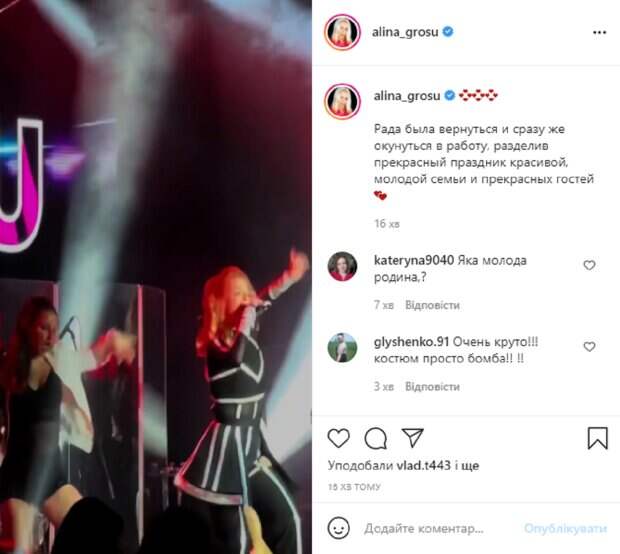 Видеонарезку со своего выступления на частном мероприятии Алина опубликовала в своем Instagram. На кадрах Гросу самозабвенно выступает на сцене в компании своей подтанцовки, девушки и парни отлично дополнили динамичное выступление звезды. Одной из первых на видео слышно песню "Бджилка", которую Алина явно переделала и спела на новый лад. В подписи к публикации певица написала: "Рада была вернуться и сразу же окунуться в работу, разделив прекрасный праздник красивой, молодой семьи и прекрасных гостей". Пользователи тут же принялись комментировать видео: "Какая молодая семья?", "Очень круто! Костюм просто бомба!", "Ты молодец, так держать. Мне очень нравиться твое творчество", "Красотка", "Звёздочка". Напомним, Гросу после развода с мужем показала самого надежного мужчину ее жизни: "Я люблю тебя". Также мы сообщали, что Алина Гросу поделилась личными кадрами с новым возлюбленным: "Целует...".