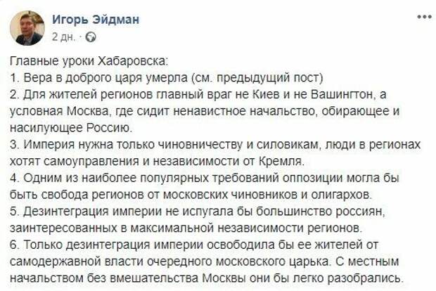 Делая выводы из протестов, убежден Эйдман, становится ясным, что империя в России необходима лишь чиновничеству и силовикам, обычные люди в регионах желают самоуправления и независимости от Кремля. "Дезинтеграция империи не испугала бы большинство россиян, заинтересованных в максимальной независимости регионов. Только дезинтеграция империи освободила бы ее жителей от самодержавной власти очередного московского царька. С местным начальством без вмешательства Москвы они бы легко разобрались", – подытожил Игорь Эйдман. Напомним, что в Санкт-Петербурге и Москве прошли акции протеста против обнуления сроков президента Путина Власти акцию не согласовали, организаторы провели ее в формате сбора подписей за обнуление итогов голосования. В акции приняли участие порядка 500 человек. В пикете никто не стоял, лозунги почти не выкрикивали, только некоторые кричали "Путин, уходи". Собравшиеся подписали иск. Также аналогичная акция прошла в Санкт-Петербурге. На Невском проспекте своей очереди поставить подпись ждали около тысячи человек. Напомним, что в Хабаровском крае местные жители выступили против ареста обвиненного в организации убийств губернатора Сергея Фургала Также они требуют отставки президента РФ Владимира Путина. Напомним, протест в Москве: силовики Путина атаковали людей, начались массовые зачистки, кадры. Как сообщала Politeka, бунт в РФ набирает обороты, скоро вспыхнет по всей стране. Также Politeka писала, что Путин пошел вразнос после масштабного "Майдана" в РФ.