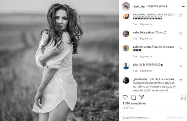Песик накрутила волосы, которые нежно спадали на ее плечи. Съемка происходила в поле. Выглядела актриса превосходно и очень нежно. «Хотелось, чтобы перед тем, как познакомиться с человеком, можно было посмотреть трейлер про него, почитать отзывы, а затем поставить оценку. Ракета в кружевных труселях», - подписала фото звезда. За полчаса пост Песик собрал почти 3 тысячи лайков. В комментариях ей оставили приятные комплименты. «Мои глаза», «Согласна», «Вы правы на 100%», «Вы очень красивая, очень стильно», - пишут пользователи сети. Как известно, Татьяна Песик родом из Тернополя. Она начинала свою карьеру, играя в КВН. Позже ее заметили в «Квартал 95». Одно время Песик даже заменяла Елену Кравец в команде «Квартала». Сейчас 32-летняя красотка составляет основу «Женского квартала». Напомним, что красотку из «Квартал 95» застукали за стыдным занятием в кустах, кадры облетели сеть: «Жизнь такая». А еще Politeka писала, что экзотическая красотка из «Квартал 95» ошарашила экспериментом с внешностью: «Такие страшные...». Также Politeka сообщала, что Елена Кравец из "Квартал 95" получила строгое наставление от мамы: "Собирай вещи и уходи".