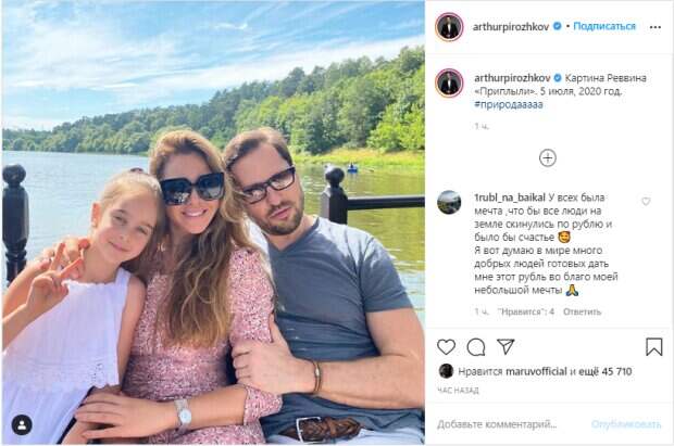 Российский комик и певец Артур Пирожков показал, как отдыхает с супругой Анжеликой Реввой и дочкой Амели на реке под Москвой Как передает Politeka.net, звезда опубликовал свежее фото в своем микроблоге в Инстаграм, на котором на фоне воды и живописного берега, утопающего в зелени, нежно обнимает своих красавиц.