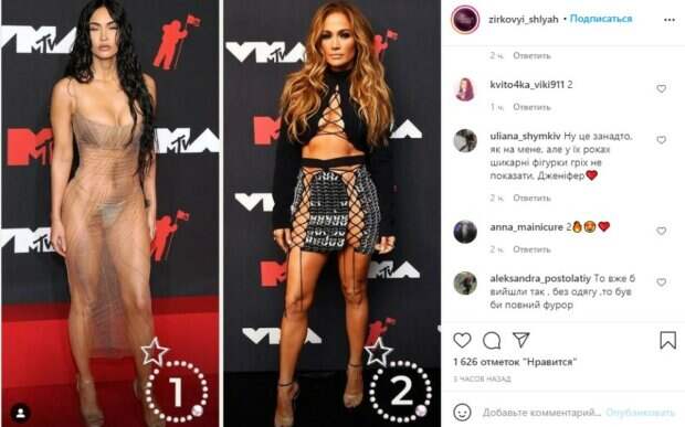 Так, 35-летняя американская актриса Меган Фокс появилась в полностью прозрачном платье от французского бренда, а завершила свой лук крошечными серебряными стрингами. Золотые туфли и украшения сделали образ еще смелее. 52-летняя Дженнифер Лопес же выбрала смелый наряд от британского дизайнера, надев топ с сеткой и мини-юбку со вставками на бедрах в виде сетки. «Битва умопомрачительных образов