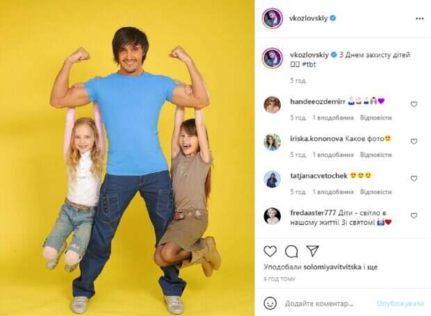 На новом снимке Виталий позирует на ярком желтом фоне в компании двух милых девочек, которые буквально повисли на его руках. Перед камерой артист появился в интересном образе – на нем стильные темные джинсы с карманами и простая голубая футболка. Похоже, этот снимок был сделан раньше, так как сейчас у артиста более густая борода и недавно он показался с белыми волосами на голове. В подписи к публикации Козловский написал: "С Днем защиты детей". Пользователи тут же принялись активно обсуждать новый снимок певца, поздравляя с праздником и засыпая комплиментами, некоторые решили, что на фото дочки Виталия. "Какое фото", "Дети – свет в нашей жизни! С праздником!", "С праздником всех деток", "Вот так обернешься, а кумир твоего детства уже с двумя детьми", - пишут фанаты. Напомним, Виталий Козловский в стильном наряде сжал кулаки и сделал признание: "Я горжусь тем, что...". Как сообщала Politeka, Козловский ошеломил откровенным признанием, не смог держать в себе: "Я любил безгранично…". Также Politeka писала, Козловский показал свое чрезмерное пристрастие, удивив беззубой улыбкой: "Дохлопался...".
