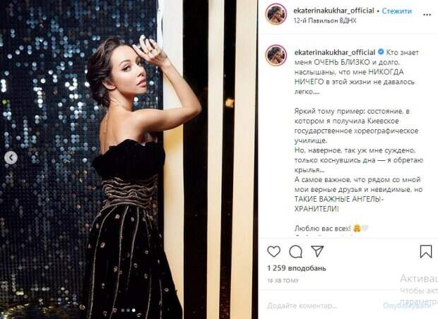 Поэтому, утверждает Кухар, ей буквально «суждено» добираться до дна, после чего она кардинально все меняет. «Но, наверное, так уж мне суждено, только коснувшись дна — я обретаю крылья...А самое важное, что рядом со мной мои верные друзья и невидимые, но ТАКИЕ ВАЖНЫЕ АНГЕЛЫ-ХРАНИТЕЛИ!» - говорится в тексте сообщения. На опубликованных кадрах Кухар позирует в черном платье, демонстрируя роскошную фигуру во всей красе. Это стало причиной бурных комментариев со стороны ее поклонников. «Катя, у вас все получится!», «великолепная», «звезда», «Восхищаюсь Вами, Вы пример очень воспитанной, умной женщины, которая трудится и результаты труда конечно же видно во всем», «очень красивая», - пишут они. Напомним, что Фреймут показалась в обнимку с молодым красавцем, фото облетело сеть Как сообщала Politeka, Фреймут зажгла с молодым красавцем из "Танців з зірками", болезнь больше не помеха Также Politeka писала, что Фреймут после скандала с Кухар на "Танцях з зірками" сделала отчаянное признание: "Из-за шока..."