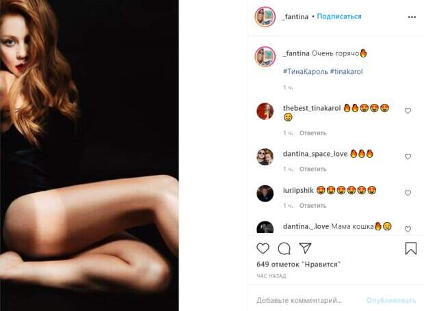 Так, в одной из фан-групп появился довольно откровенный снимок, на котором певица демонстрирует всю свою женственность и страсть. В кадре Тина Кароль   появилась в черном топе и провокационной позе, выставив на всеобщее обозрение стройные длинные ножки и упругие ягодицы. При этом часть лица артистка спрятала за золотистыми волосами, которые распустила. Свой страстный образ звезда дополнила красной помадой. Надо сказать, что выглядела она, как настоящая женщина вамп. Фанаты не пришло мимо и отреагировали на жаркий снимок восторженными комментариями. "Ах какая женщина