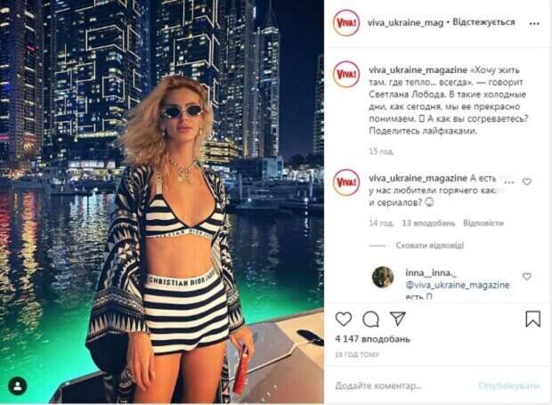 «Любимая елочка», «Ух, ну ты и куколка, Света!», «безупречно выглядишь», «великолепный образ, богиня наших сердец», «как елочка», «такой прекрасный наряд», «обожаю твое интро», - пишут ее поклонники. До этого мы рассказывали, что певица Светлана Лобода озадачила неожиданным фото «Хочу жить там, где тепло... всегда», — говорит Светлана Лобода. В такие холодные дни, как сегодня, мы ее прекрасно понимаем», - подписан снимок. Лобода запечатлена в полосатом черно-белом купальнике. При этом на нижней его части образовалась странная складка, которая смутила пользователей Сети. Пляжный образ артистка дополнила украшениями и солнцезащитными очками, несмотря на то, что солнце, судя по всему уже давно село. На плечи она набросила накидку с геометричесним узором. Напомним, искусительница Лобода обтянула свою роскошь черным латексом: "Невыносимо хороша". Как сообщала Politeka, Лобода томно раскинула руки перед окном, едва не выронив грудь из глубокого декольте: "Завораживает". Также Politeka писала, что Лобода сразила наповал видом в черном бикини с пикантной цепочкой: даже на пляже "тотал блэк".