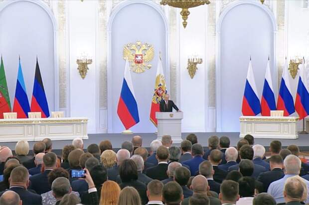 Россия призывает Украину приостановить военные действия и вернуться к переговорам. Об этом заявил президент РФ Владимир Путин во время выступления в Георгиевском зале Большого Кремлевского дворца, где проходит торжественная церемония подписания договоров о вступлении в состав РФ новых территорий.