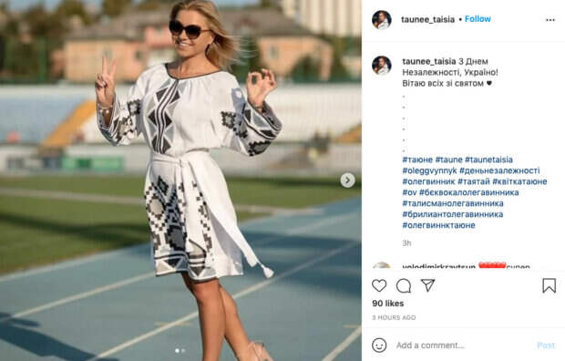 Таюне активно ведет социальные сети и показывает моменты своей жизни поклонникам. На этот раз девушка поделилась новой серией фотографий на своей странице в Инстаграм. На снимках Таюне на стадионе позирует на камеру в белой вышиванке. Свой образ она дополнила солнцезащитными очками. "С Днем Независимости, Украина! Поздравляю всех с праздником", поздравила поклонников Таюне. Поклонники засыпали девушку приятными словами в комментариях: "Наша любимая принцесса", "Супер красавица". Ранее сообщалось, "Тайная супруга" Олега Винника в прозрачной юбке и корсете зажгла с его "волчицами" у моря: "Спасибо любимому" Также, "Тайная супруга" Олега Винника на радостях случайно сверкнула красивым животиком: "Танцуют все!" Politeka рассказывала, "Тайную супругу" Олега Винника неожиданно сравнили с Поляковой: "Мне одной кажется, что они..."