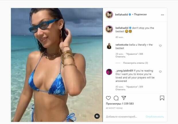 Известная модель Белла Хадид показала себя и подружек, с которыми решила провести досуг На кадрах Белла позирует в бикини на веревочках и очках. Рядом можно увидеть и других девушек в купальниках, а еще парней. Все были на пляже и позировали в воде и на берегу, развлекаясь на солнце. Видео получилось довольно солнечным и соблазнительным.