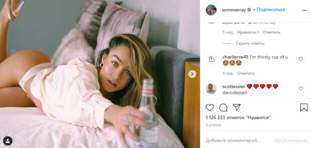 При этом сама девушка домашними кадрами или простыми селфи почти не делится. Именно поэтому фото на которых Соммер в простом виде блистала в постели сразу привлекло внимание поклонников. Девушка позировала в одной свободной кремовой рубашке и светлом нижнем белье. Потянувшись за бутылочкой воды, Соммер выглядела весьма соблазнительно. Девушка также восхитила стройными ножками, которые приподняла повыше, представ перед объективом во всей красе: «Ты такая горячая