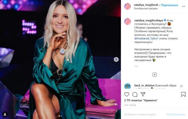Особенно характерные) Хотя, конечно, костюмы из шоу «Маскарад» очень сложно переплюнуть! Настроение у меня сегодня игривое))) Предвкушаю, что выходные будут яркие и насыщенные», - написала Могилевская. Она также поделилась снимками, на которых позирует в роскошном шелковом платье темно-зеленого цвета. Наряд с запахом позволяет певице продемонстрировать декольте, в котором просматривается черный боди. Дополняют образ Могилевской крупные украшения. Поклонники певицы активно комментируют ее пост. «Шикарные ноги», «Наталья Всегда восхищалась Вашей красотой! Но в данный момент жизни выглядите восхитительно!», «Раскрашенная старая женщина», «какая же вы красивая!», «Наташа вы как всегда великолепны», «С годами только хорошеете», - пишут люди. До этого мы рассказывали, что Могилевская опубликовала свежее видео в своем микроблоге в Инстаграм, где предстала за рулем старенького "Москвича". Кадры сделаны в ретро-стиле: Могилевская мчала по пустынной дороге, свернув затем на проселочную, любуясь собой в зеркале заднего вида, высунув руку из открытого окна и периодически поправляя макияж и прическу. Напомним, довольная Могилевская похвасталась безупречным лицом вблизи: «На Ивлееву похожа». Как сообщала Politeka, Наталья Могилевская на машине врезалась в дом с людьми. Также Politeka писала, что Могилевскую довели до истерики взрывным номером, Монатик не сдержался: «Мою песню пела ка…».