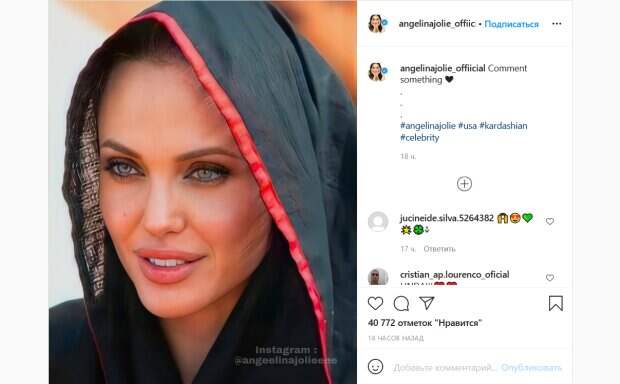 Как сообщает Politeka.net, яркое фото Джоли появилось на одной из таких страниц. На снимке актриса запечатлена крупным планом. Она одета в черное, а на голову накинула легкий капюшон с красной каймой. Все внимание на фото сосредоточено на лице актрисы. Особенно выделяются ее глаза, которые Джоли подчеркнула темными тенями и карандашом. На фото актриса слегка улыбается, от чего ее лицо выглядит еще красивее. Фанаты звездной красотки не смогли пройти мимо такого фото. «Боже, какая она красивая», «Восхитительная», «Роскошная принцесса», «Я люблю тебя. Ты самая красивая женщина в мире», «Настоящая королева сердец», «Ее глаза такие красивые», «Она добавляет красоту к вещам, которые ее окружают», - пишут люди. Ранее мы писали, что фанаты наши фото Джоли, на котором актриса запечатлена в момент переодевания. Звезда сидит на полу в расстегнутом платье цвета шампанского. Его легкая сверкающая ткань спадает со спины Анджелины, а на груди она вынуждена придерживать ее руками. Напомним, Анджелина Джоли посветила упругой ягодицей, неприлично задрав ножку: "Не женщина, а богиня". Как сообщала Politeka, 45-летняя Анджелина Джоли вызвала бурю эмоций, одним жестом: «Удивительно красива…». Также Politeka писала, что роскошная Джоли кокетливо приспустила платье, засветив лишнее и взбудоражив воображение: "Можешь снять все".