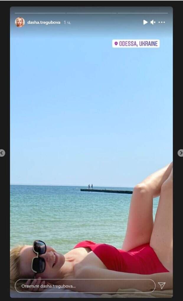 В этот раз Даша решила показать, как релаксирует на пляже. Красотка в красном купальнике лежала у моря, задрав ноги вверх. Трегубова повернула голову в сторону камеры, улыбнувшись для снимка. Как можно понять, Даша отправилась к Черному морю в Одессу. На втором фото Даша уже сидела, а не лежала. Красотка согнула ножку, чуть-чуть добавив игривости кадру. Фанаты не ставили лайки и не писали комментарии, так как в сторис Инстаграм нет подобных функций, но так и хочется добавить: "Лучшая". Сообщалось, что популярная телеведущая и актриса Дарья Трегубова с коллегами отправилась в тур по Хмельницкой области. В этот раз Дарья Трегубова поделилась кадрами своего тура с коллегами. Звезда была в белой рубашке и джинсах, завершили ее образ стильные аксессуары. Напомним, звезда "Х-фактора" Трегубова рассказала о неожиданном испытании на съемках Также Politeka сообщала, что Трегубова из "Х-Фактора" без одежды прикрыла роскошные формы только пионами А еще Politeka писала, что Трегубова из "Х-Фактора" пошалила перед камерой с роскошной подругой-брюнеткой