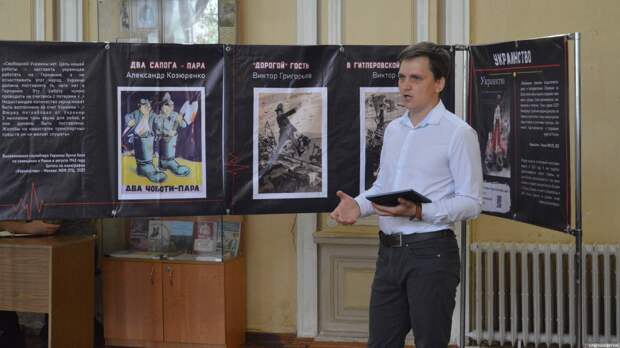 Выставка будет доступна для посещения до 20 сентября. Мероприятие открыла заведующая библиотечным отделом «Юность» Лариса Шмойлова которая рассказала об актуальности этой выставки, поскольку сегодня мы наблюдаем возрождение фашизма на Украине. После этого с докладом о советских плакатах времён Великой Отечественной войны выступил координатор новочеркасского отделения движения «Суть Времени» Дмитрий Тимонин. Докладчик рассказал о советских художниках и творческих коллективах («Кукрыниксы», «окна ТАСС»), которые вдохновляли наших солдат на борьбу с немецко-фашистскими захватчиками. Тимонин также рассказал об образах фашизма, которыми пользовались авторы, и отдельно коснулся изображения бандеровцев. «Образы бандеровцев достаточно карикатурные, поскольку тогда бандеровцы особой боевой силы не представляли», — пояснил он. «Было несколько дивизий, которые предпочитали не сражаться с Красной Армией, а сражаться в лучшем случае с партизанами, но чаще — с мирным населением», — рассказал докладчик. «К сожалению за последнее время бандеровская идеология сильно изменилась», — констатировал представитель «Сути Времени». «Она захватила всю Украину и стала намного мощнее», — отметил он. В заключении доклада Тимонин рассказал о монографии «Украинство», в которой одноименный феномен рассматривается на самых разных уровнях. Напомним, «Украинство» — коллективная монография, посвященная феномену украинства как конструкта. Это многотомное издание, написанное Александровской коммуной под руководством философа, политолога, лидера движения «Суть времени» Сергея Кургиняна. Читайте также: Украинство