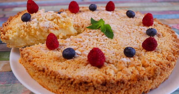 Получится еще вкуснее. Количество сахара можно уменьшить.[caption id="attachment_64167" align="aligncenter" width="1263"] Оригинальный десерт на все случаи[/caption]Приготовление: В миску просеять муку, добавить щепотку соли, сахар и сливочное масло (холодное). Перетереть все до однородной крошки. Добавить яйцо, перемешать. В конце еще добавить разрыхлитель. Крошку поставить в холодильник. В кастрюле с толстым дном смешать желтки, сахар. Перетереть венчиком. Просеять муку, добавить соль. Перемешать. Постепенно соединить с холодным молоком. Варить заварной крем сначала на среднем огне, потом на маленьком до загустения. Массу постоянно перемешивать. Крем перелить в миску, накрыть плотно пищевой пленкой, остудить до комнатной температуры. По необходимости поставить в холодильник, если пирог будете формовать не сразу. *Во время приготовления крема можно добавить лимонную цедру для аромата. Или уже, когда заварной крем будет готов, добавить ванильный сахар. Дно и бока формы застелить пергаментом. Выложить половину крошки, хорошо утрамбовать ложкой. Затем выложить весь заварной крем, не доходя 1 см до краев (чтобы крем во время выпечки не вытек). В конце распределить вторую половину крошки. Выпекать торт-пирог при 180 ℃ 35-40 минут.Подробный видеорецепт.[embed][/embed]