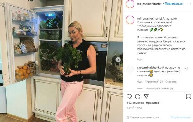 Правда, как метко отметили пользователи в комментариях, на увядающем лице Волочковой почему-то ее диета отразилась не наилучшим образом. "Анастасия Волочкова показала свой "холодильник здорового питания"