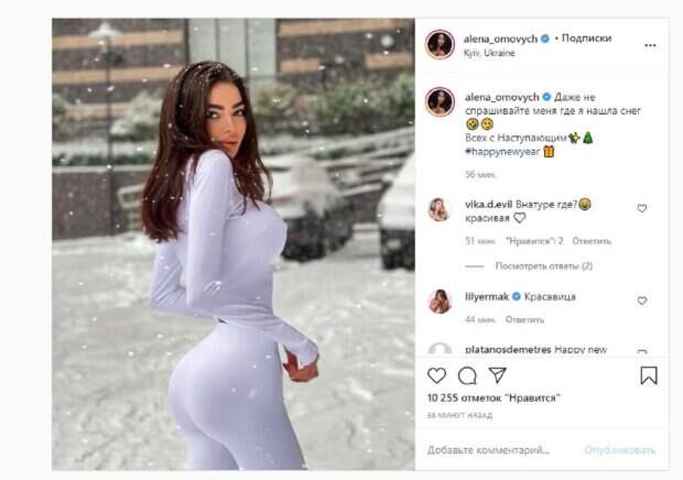 Известная модель Алена Омович, которую называют украинской Кардашьян, показала себя на необычной локации На фото Омович позировала в белом тоненьком костюме, который идеально подчеркнул формы красотки. Алену совсем не смущало, что выпирал бюст, благодаря чему кадр получился очень пикантным. Девушка стояла на улице среди снега.