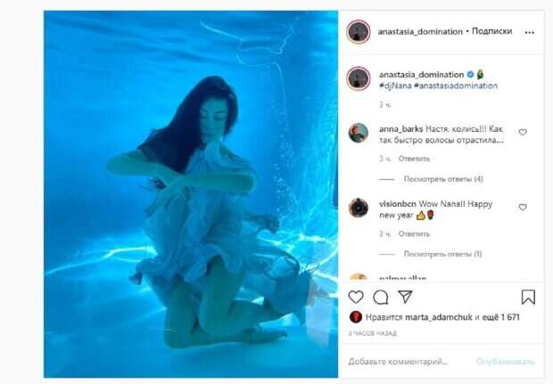 Об этом пишет Politeka.net со ссылкой на страничку знаменитости. Фанаты поставили почти 2 тысячи лайков и написали комментарии: "Настя, колись!!! Как так быстро волосы отрастила....", "Вау, Настя. С Новым годом", "Тебе нужен спасатель?", "Какая ты воздушная в водной стихии", "Вау, феноменальная". Мы писали, что украинская певица и экс-Nikita Анастасия Кумейко впечатлила поклонников соблазнительными формами, распахнув курточку. «Киця хочет», - коротко говорится в сообщении. Уточним, что на опубликованных снимках Кумейко позирует, примеряв маску в стиле кошечки. При этом девушка эффектно распахивает курточку, демонстрируя аппетитные прелести во всей красе. Сообщалось, что украинская Dj Nana Анастасия Кумейко, которая раньше выступала в группе Nikita, впечатлила фигурой во время «грязного» танца. «С днем рождения», - коротко говорится в сообщении. Уточним, что на кадрах знаменитость в «невидимом» наряде, элегантно демонстрируя формы во время танца. При этом поклонников Кумейко решила избавить от возможности что-либо сказать, выбросив кадры у себя на странице в Stories. Напомним, экс-Nikita Кумейко соблазнила видом, покрасовалась перед камерой в бриллиантах Также Politeka сообщала, что экс-Nikita устроила пикантную фотосессию без лифчика, поразив сходством с Моникой Беллуччи А еще Politeka писала, что раскованная экс-Nikita пустилась плясать и разбередила фантазии видом в коротком халат