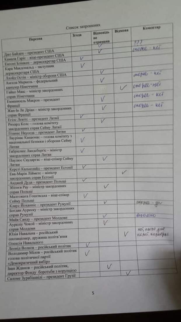 Документ выглядит как список из всех тех лиц, кого Украина хотела бы видеть на мероприятии. Он разделён на три графы: согласились, не согласились, пока не ответили. Также есть четвёртая графа с комментариями в адрес каждого решения. «Тайное рано или поздно, но всегда становится явным. Хотя и стремилась первый заместитель министра иностранных дел Украины Эмине Джапарова засекретить список участников «Крымской платформы», но не вышло. Часть его оказалась в наших руках. Спасибо её криворуким помощницам, которые раскидывают по МИД конфиденциальные документы и неравнодушным украинским братьям», — написали авторы канала. Фото: Telegram-канал «Шептун» Список гостей «Крымской платформы» – если это действительно он – выглядит весьма интересно. Так, первым делом в нём идёт американская делегация. Напротив фамилий американского лидера Джо Байдена, его заместительницы Камаллы Харрис, а также Ллойда Остина (министр обороны США) стоят галочки «ответ не получен». В комментариях написано, что их, скорее, не стоит ожидать. А вот госсекретарь Энтони Блинкен уже согласился прибыть на саммит – причём вместе со своей заместительницей. Печальная ситуация и с делегациями из Франции и Германии. Так, ни от президента французского государства Эммануэля Макрона, ни от министра иностранных дел его правительства ответ не получен, в комментариях написано «скорее не приедут». Та же ситуация и с канцлером ФРГ Ангелой Меркель – она ничего не ответила и «скорее не приедет». А вот глава немецкого МИД Хайко Маас, судя по документу, уже успел прямо отказаться от участия в «Крымской платформе». Предсказуемо, согласием ответили президенты Латвии и Литвы, а также другие представители их стран (при этом далеко не все). А вот глава МИД Эстонии Ева-Мария Лийметс ответила почему-то отказом и не захотела ехать на украинский саммит. Впрочем, нас почтит визитом президент прибалтийской страны Керсти Кальюлайд. Всё хорошо и с польской делегацией: она, согласно слитой информации, полным составом планирует приехать на посвящённое вопросам деоккупации полуострова мероприятие. Ожидается, вероятно, также присутствие президента Румынии. Вполне вероятно, что прибудет и глава Молдовы Майя Санду, отношения которой с Киевом осложнились после эпопеи с судьёй Чаусом. Отказался приезжать для участия в «Крымской платформе» даже президент Грузии. Но самое смешное – это отсутствие желание посетить Украину и поговорить на тему Крыма у Юлии Навальной, жены сидящего в тюрьме российского оппозиционера Алексея Навального. Комментарий напротив её фамилии – «отказалась, плохо для политической карьеры». Тут, как говорится, комментарии излишни. Ранее мы писали о планах МИД Украины засекретить список участников саммита по Крыму «во избежание провокаций». Если слитый сегодня документ – это правда, то, как мы видим, у ведомства ничего не получилось.