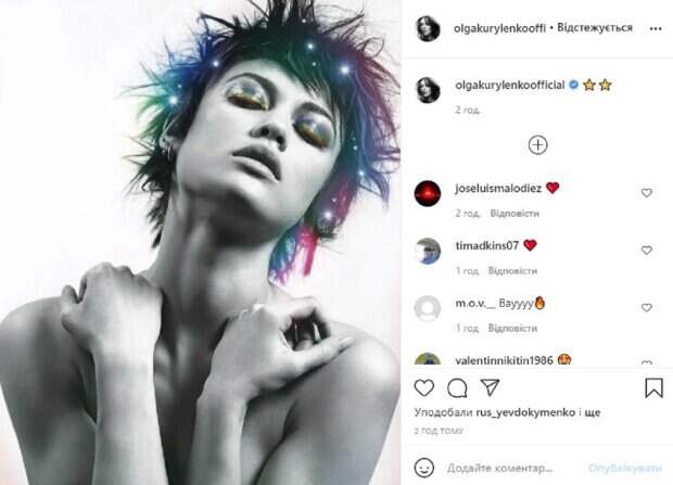 Модель и киноактриса Ольга Куриленко использовала фильтр, и обрамила свои растрепанные волосы звездочками. Также интересен акцент в макияже, который использовала модель – яркие тени, нанесенные на веки знаменитости, желтого и синего цвета с серой полоской сверху Глаза Ольга закрыла, придав образу пылкости и страсти. Фанаты обомлели, увидев такой необычный образ своей любимицы, и прокомментировали фото множеством сердечек, смайликов и других эмодзи. Также многие высказали восхищение словами: "Горячий лук ❤️", "❤️