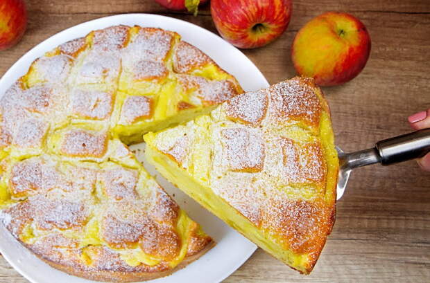 Влейте теплое молоко. Перемешайте и поставьте на огонь. Постоянно помешивая, доведите крем до кипения. Когда появятся первые пузыри и масса станет в меру густой, выключите огонь. Добавьте сливочное масло и перемешайте. Готовый крем накройте пленкой в контакт и оставьте остывать. Для теста соедините яйца с сахаром, ванильным сахаром, солью и перемешайте миксером. Добавьте сметану, влейте растительное масло и снова перемешайте. Просейте муку и разрыхлитель. Перемешайте лопаткой до однородности. Яблоки нужно очистить от кожуры, нарезать кубиками и взбрызнуть лимонным соком, чтобы не темнели. Затем яблоки отправьте в тесто. Форму застелите пергаментом. Вылейте тесто, разровняйте. Заварной крем переложите в кондитерский или обычный пакетик, нарисуйте на тесте решетку. Выпекать пирог 35-40 минут, температурный режим 180℃. Вкуснейшая шарлотка с заварным кремом готова! Пошаговый рецепт смотрите в видео. По желанию шарлотку можно посыпать сахарной пудрой