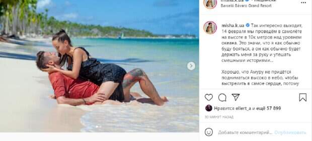 «Так интересно выходит, 14 февраля мы проведём в самолёте на высоте в 10к метров над уровнем океана. Это значи, что я как обычно буду бояться, а он как обычно будет держать меня за руку и утешать смешными историями...», - написала Ксения. На первом кадре парочка позирует, лежа на берегу моря, вся мокрая от воды. Мишина оседлала Эллерта, нежно обняв его и засветив свою стройную ножку, которую обхватил Александр. Влюбленные не сдерживают эмоций. На втором снимке Эллерт подхватил Мишину на руки и занес с лазурное море. Снимок, по всей видимости, сделан перед поцелуем. « Я люблю тебя @ellert_a и хочу чтобы ты ещё крепче меня обнимал, ещё чаще целовал и никогда не переставал будить среди ночи сонными словами «люблю тебя»❤️