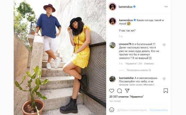 И хотя сейчас Настя уже давно в Украине, у нее еще остались фото из поездки, которыми она не успела поделиться с фанатами. Один из таких снимков Каменских опубликовала в новом посте. На нем она позирует рядом с Потапом, который в какой-то момент решил навестить ее в чужой стране. На снимке пара эффектно позирует у стены дома. Потап в белых шортах, синей рубашке и бордовой шляпе стоит на ступеньках чуть выше своей жены. А Настя томно оперлась на стену, приподняв одну ногу. Певица позирует в ботинках, шляпе и легком желтом сарафане в цветочек с короткой юбкой, которая позволяет ей показать свои стройные ножки. «Какая погода, такой и mood. У вас так же?», - подписала снимок Каменских. Ее поклонники тут же отреагировали на публикацию. «В ботинках таких жарко наверно», «Вы крутая пара, восхищаюсь вами», «Да, также. Какая вы красивая», «Бони и Клайд палюбас», «Вы просто суперские))) огромного счастья вам!!!!», «Огонь фото», «Аккуратней с фотошопом», - пишут люди. Напомним, Каменских ошарашила откровением о расставании с Потапом: "Мы не принадлежим друг другу". Как сообщала Politeka, Каменских в шапке и свитере показала их ритуал с Потапом: "Дождь не помеха". Также Politeka писала, что Настя Каменских разговорилась о драках и ссорах с Потапом: "Повыдирала все волосы".