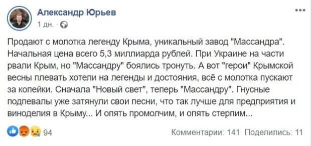 «Продают с молотка легенду Крыма, уникальный завод "Массандра". Начальная цена всего 5,3 миллиарда рублей. При Украине на части рвали Крым, но "Массандру" боялись тронуть. А вот "герои" Крымской весны плевать хотели на легенды и достояния, всё с молотка пускают за копейки. Сначала "Новый свет", теперь "Массандру". Гнусные подпевалы уже затянули свои песни, что так лучше для предприятия и виноделия в Крыму... И опять промолчим, и опять стерпим...», – пишет пользователь Александр Юрьев. «За эти деньги вы получите 3912 га виноградников и 1500 га земель свободного назначения, восемь самостоятельных винодельческих предприятий (заводы по сбору и обработке винограда и изготовлению виноматериалов)», – добавляет RoksolanaToday. «Как писал в Forbes уважаемый (и разбирающийся в теме) Андрей Григорьев :"при всех дисконтирующих факторах цена едва ли будет ниже 12-15 млрд рублей." Для друзей Путина дисконт 3», – отмечает Eduard Crane. «Когда с наших квартир и домов выселять начнут, тогда орать начнём. Бизнес уже у всех забрали», «А уже начинают скоро сносить более 220 домов в Перевальном и Заречном . Ради дороги для игорной Зоны в Ялте (», «Ну так пока не придет осознание того, что так называемая крымская весна – это обычное преступление и грабеж, не придет и понимание, что то, что происходит, – это логичное продолжение», «А дальше-то что продавать? Всё. Больше не осталось ничего. Не думаешь, что именно эти все шесть лет и были нужны для того, чтоб продать вот это вот всё? Наверное, у них и предназначение такое. Капитализм», – пишут в комментариях крымчане. Напомним, в Крыму решили продать наследие ЮНЕСКО на "Авито". Как сообщала Politeka, четыре страны СНГ выступили против Украины. Также Politeka писала, что оккупанты устроили массовое преследование крымчан, вынесено 140 приговоров.