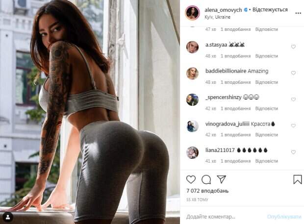 Известная модель Алена Омович, которую называют украинской версией Кардашьян, сверкнула главным достоинством Как передает Politeka.net, свежее фото красотка опубликовала на своей странице в Инстаграм. Омович встала в неприличную и немного развратную позу, повернувшись к камере «пятой точкой». Девушка выбрала для фото обтягивающие серые лосины, которые максимально обтянули ее формы.