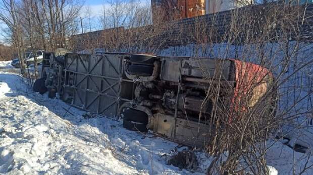 Пассажирский автобус съехал в кювет и перевернулся около поселка Новый Уптар в Магадане. Три человека пострадали, рассказали в УМВД по Магаданской области. Авария случилась около 11:55 часов 11 ноября.