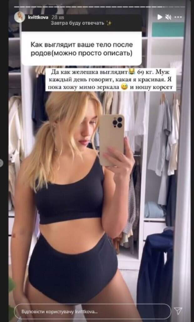 На новом сторис Даша показала, как выглядит после родов. Девушка надела шортики и топик, демонстрируя свои формы в зеркале. "Как выглядит ваше тело после родов (можно просто описать)", - спросила фанатка. "Да как желешка выглядит. 69 кг. Муж каждый день говорит, какая я красивая. Я пока хожу мимо зеркала и ношу корсет", - написала Квиткова под публикацией. На втором сторис Даша показалась с сыном. У красотки спросили, что делай Лев (так зовут малыша). Квиткова отметила, что ребенок сейчас кушает и добавила сторис. Напомним, "Холостяк" Добрынин показал эксклюзивные кадры с Квитковой во время родов А еще Politeka писала, что жена "Холостяка" Добрынина рассказала, какой стала после рождения сына Также Politeka сообщала, что "Холостяк" Добрынин растрогал кадром с новорожденным сыном