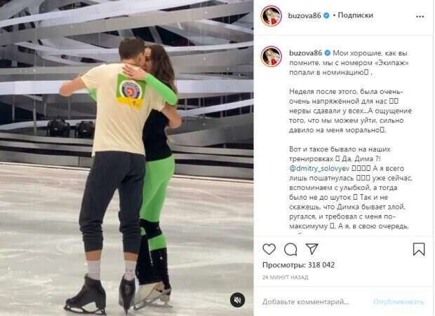 (Чтобы посмотреть видео, доскролльте до конца страницы) В этот раз Ольга поделилась кадрами, снятыми на льду во время постановки номера. Звезда распустила длинные волосы и сделала легкий макияж. Для занятий артистка выбрала салатовые лосины, обтянувшие ее ягодицы. Соловьев во время движений показал Бузовой кулак, та с печально взглянула на него. "Мои хорошие, как вы помните, мы с номером «Экипаж» попали в номинацию