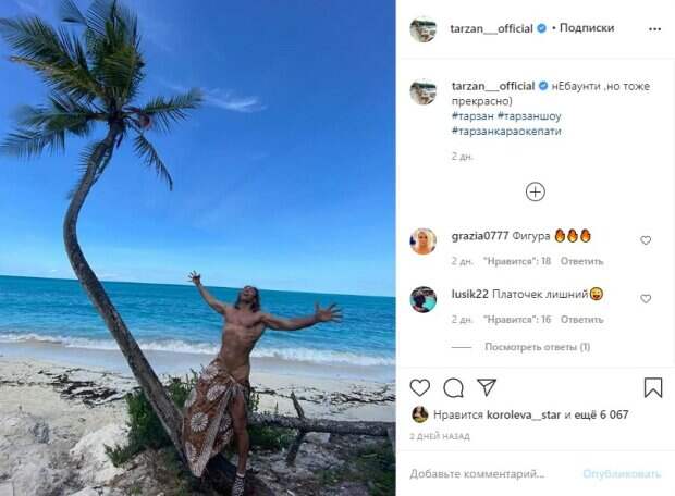 net. И вот, на своей странице в Инстаграм Тарзан показал новую фотографию с отдыха. Сергей стоит на берегу моря или океана возле пальмы, из одежды на нем только тапочки, носки и покрывало, которым Глушко прикрыл "самое интересное" место. "нЕбаунти ,но тоже прекрасно)", – подписал кадр стриптизер. Фанаты, в основном женского пола, начали наперебой захваливать его в комментариях. Мужчины наоборот – в основном писали негативные или даже оскорбительные отзывы. Отна из почитательниц Тарзана поинтересовалась, одна она увеличила фото, чтобы рассмотреть Тапрзана поближе. "Я одна фотку увеличивала?", – спросила она. В ответих девушки признались, что не одна. Многие рассматривали тело стриптизера вблизи. Ранее мы сообщали, что Наташа Королева похвасталась томным образом. Новое фото артистка опубликовала на своей странице в Инстаграм. (Чтобы посмотреть - проскролльте вниз) "Пятница 13