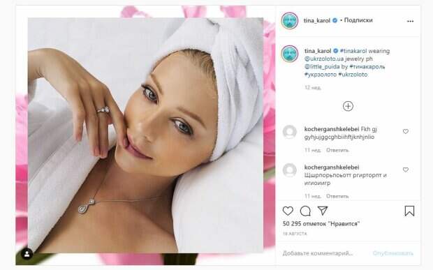 Тина Кароль, Светлана Лобода, Ольга Бузова и другие звезды похвастались своими украшениями На первом фото позировала Тина Кароль. Красотка была в халате, а волосы спрятала под полотенцем. Образ девушка дополнила цепочкой с кулончиком, а также кольцом на пальце. Фото получилось очень нежным и даже соблазнительным.
