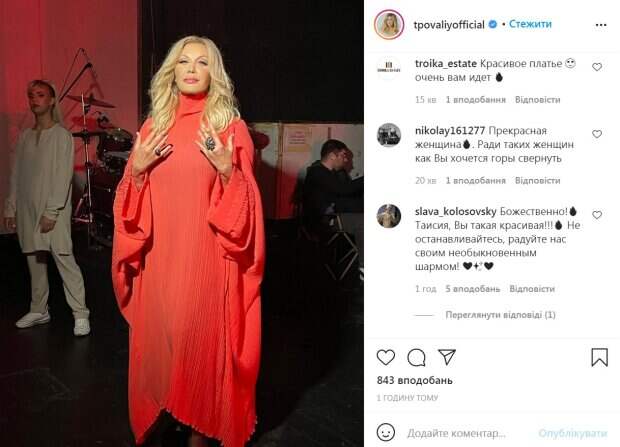 Певица Таисия Повалий похвасталась видом в оригинальном красном платье Как сообщает Politeka.net, известная украинская артистка Таисия Повалий, которая в свое время сбежала в Россию и больше не выступает на родине, показала новое фото на своей странице в Instagram. Повалий позировала в длинном красной платье-балахоне.