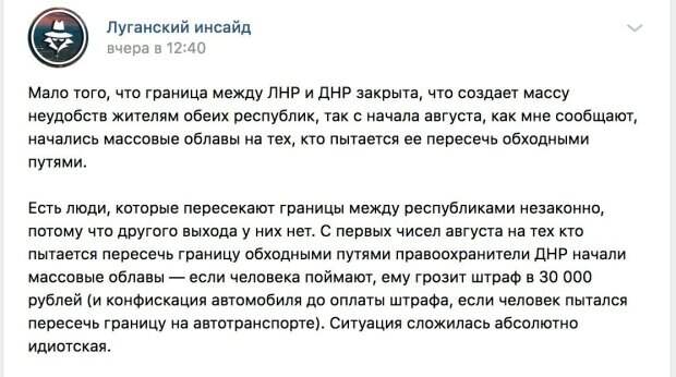 Закрытие «границ» между самопровозглашенными «ДНР» и «ЛНР» на Добассе из-за угрозы распространения китайского вируса привело к неожиданным последствиям Каким именно, написал в своем телеграмм-канале известный донецкий журналист Денис Казанский. Он опубликовал скрин сообщения из группы «Луганский инсайд» в соцсети, где рассказали об облавах, которые устроили с первых чисел августа на тех, кто пытается обходными путями попасть из одной «республики» в другую.