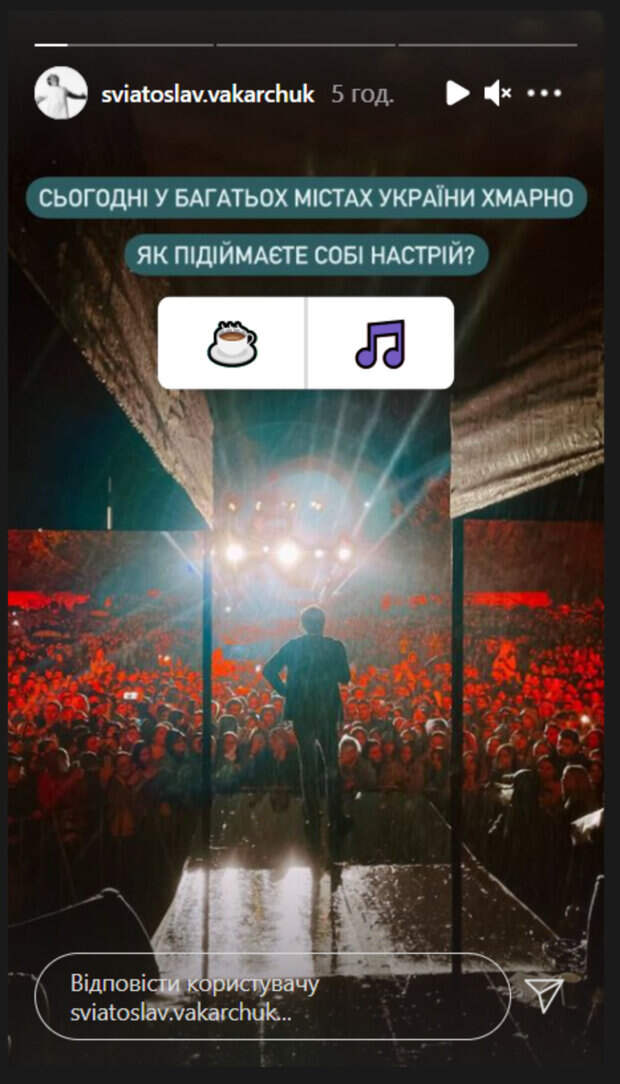 », - обратился Вакарчук к поклонникам, добавив на выбор смайл кофе и музыки. Во второй сторис артист отметил, что сам предпочитает поднимать себе настроение музыкой. «Я сегодня выбираю песню», - отметил Вакарчук, сопроводив фото своей песней «Все буде добре». Также артист посоветовал украинцам тоже обратиться к музыке и посмотреть последний концерт «Океана Эльзы», который группа давала во Львове. Отметим, что за последний год в жизни музыканта произошло много важных событий. Он развелся со своей женой и заявил о рождении сына, которого назвали Иваном. Напомним, что Святолав Вакарчук после развода засветился в компании молодой красотки: "Это просто невозможно". Также Politeka сообщала, что Святолав Вакарчук снял футболку на сцене, прижавшись к эффектной блондинке: "Невероятная честь быть...". Ранее Politeka рассказывала, что Святолав Вакарчук рассказал об удивительном событии после рождения сына: "Когда я держал его в руках...".