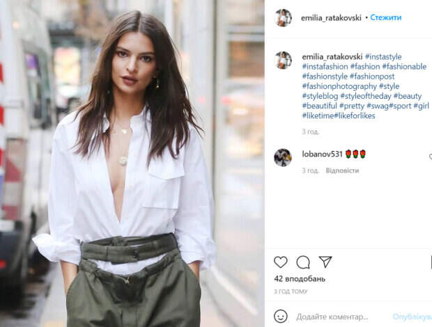 Модель заправила рубашку в объемные зеленые штаны, создав экстра-декольте. Эмили показала еще один модный способ носить белую рубашку, который, к тому же, способен свести с ума прохожих на улице. Волосы яркая девушка оставила распущенными. Уличный образ дополнили серьги и ожерелье. Как известно, сейчас Эмили Ратаковски находится на последних месяцах беременности. Несмотря на положение девушка продолжает сниматься в весьма откровенных фотосессиях. Напомним, что Ратаковски прославилась как модель и актриса после откровенных съемок в одном из музыкальных клипов. Девушка не стесняется демонстрировать свои прелестные формы, поэтому ей с удовольствием предлагают рекламные контракты различные компании. Ранее мы писали, что в сети появился провокационный снимок с Ратаковски. Звезда стояла под душем, расстегнув кофточку. Модель забыла прикрыться, демонстрируя свою аппетитную грудь. Напомним, что Ратаковски на последнем месяце беременности показала формы в золотом бикини: "Будет мальчик!". А еще Politeka писала, что Ратаковски лишила дара речи, показав аппетитную фигуру в леопардовом купальнике: "Незаконно!". Также Politeka сообщала, что Ратаковски в купальнике предалась страсти с мускулистым красавцем в авто: "А в глазах огонь".