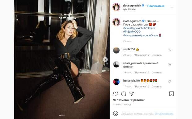 На ней очень короткое черное платье-рубашка с большим поясом, а также высокие лакированные сапоги. Из-за отсутствия брюк или юбки образ певицы выглядит слегка небрежным и вызывающим. В таком наряде Злата томно позирует, сидя на полу. Красотка написала, что расслабляется по случаю пятницы, а настроение у нее при этом «красное сухое». «Пятница ...Пора расслабиться», - подписала снимки Огневич. Ее поклонники не смогли пройти мимо такого поста. «Креативний фотосет», «Да, отдохни душой и телом», «Вы такая красивая!», «Кицька», «Дикая кошка!», «Пора зажигать», «Понедельнмк похмельник, вторник повторник», «Злата, ты огонь!», «Львица, секси, люблю!», «Бомба-ракета!», - пишут люди. Ранее мы писали, что Злата показала фигуру в постели. Огневич лежала на кровати, закинув ножки. Артистка была в светлой футболочке и зеленых штанах. Разные аксессуары завершили образ звезды. Напомним, хищная Злата Огневич задурманила головы мужчин сладкими изгибами в шелковом платье: "Женская сила…". Как сообщала Politeka, Злата Огневич без лифчика и стыда раскрыла пиджак, заставив глотать слюнки: "Градус растет". Также Politeka писала, что соблазнительная Злата Огневич показала свои лакомства, пошалив на постели: "Солодка кара. ..".