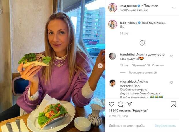 "Така вкусняшка!!! Я☺️", – подписала снимки знаменитость. Фанаты наперебой начали ставить лайки и оставлять под постом разнообразные комментариями. "Леся на цьому фото така красуня! ❤️