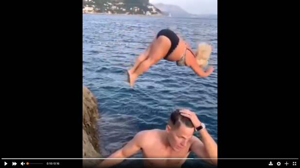 Всё происходит на пляже одного из курортов Черного моря. В начале мы видим как из воды выходит атлетического вида мужчина. И невольно думаешь, что это видео посвящено ему. Однако в кадр буквально «врывается» летящая откуда-то сверху полная женщина в купальнике. Видимо в её планах был грациозный полёт и изящный вход в воду.
